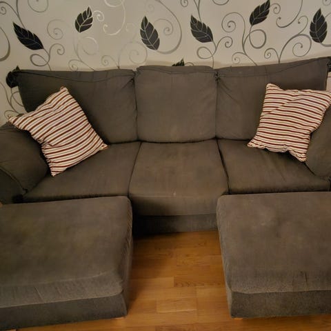 Gråmelerad liten soffa, perfekt för små utrymmen. Har en fläck på ena sittkudden som inte går bort.