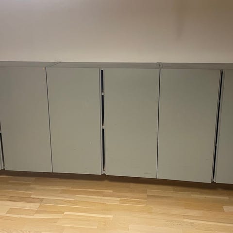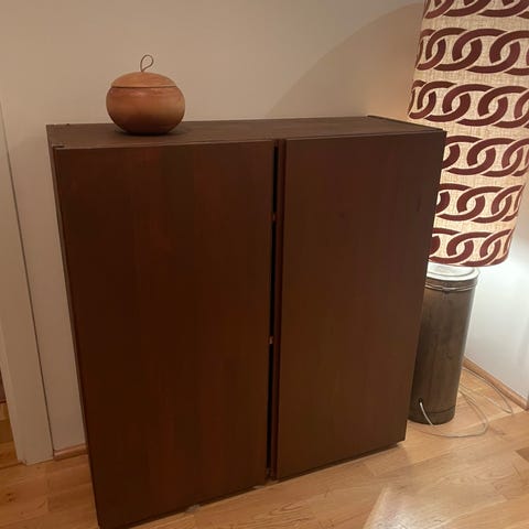 Vitlaserat skåp av furu. Medföljande svarta möbelben