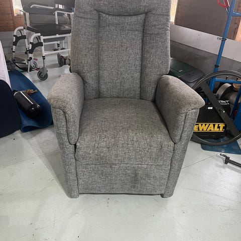 Grå fotölj med lyftfunktion gör fotöljen lätt att resa sig ur. Med fjärrkontroll kan fåtöljens rygg- och fotstöd ställas in.