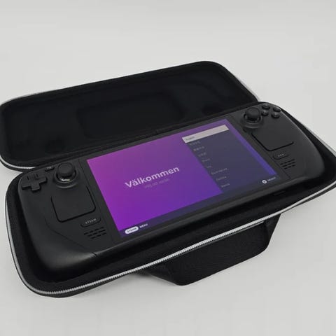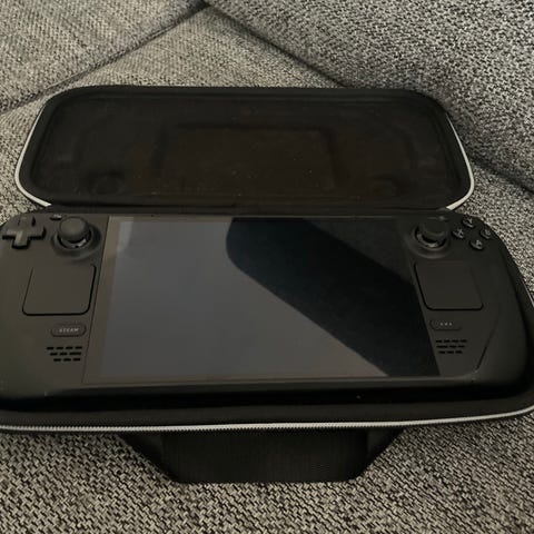 Steam Deck OLED med bärväska, laddare och originalkartong.