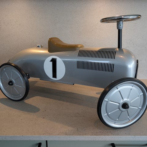 Den här bilen har egentligen inte använts, utan har mest fungerat som dekoration i hans rum när han var omkring 1 år. Säljer därför. Den har fåtts i present, så jag vet tyvärr inte vilket märke den är.
