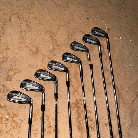 Titleist AP1 golfklubbor med förlängda stålskaft en tum och grepp. Setet innehåller järn 3-9, W, P samt en S (Cobra 57).