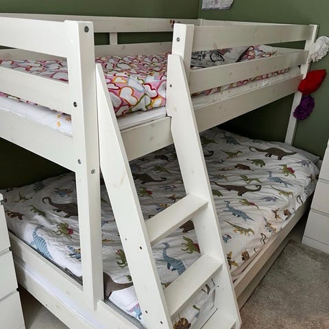 Jysk Vestervig våningssäng. Inköpt för 1,5 år sedan och överlag i gott skick. Märken från tuschpenna på ett par ribbor i överslafen, går att vända uppåt så syns det inte.