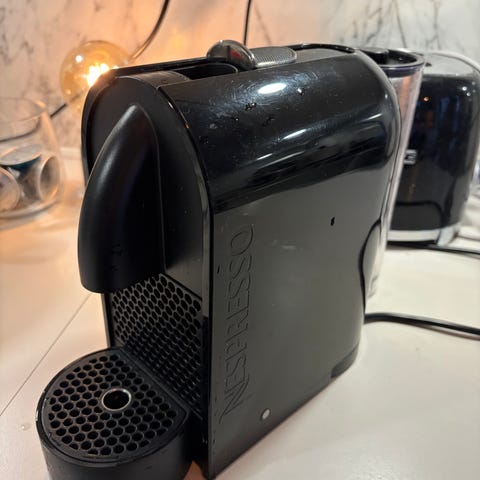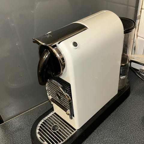Nespresso Essenza Mini kaffemaskin i vit färg. Kompakt design med vattentank på baksidan. Passar för användning med Nespresso-kapslar.