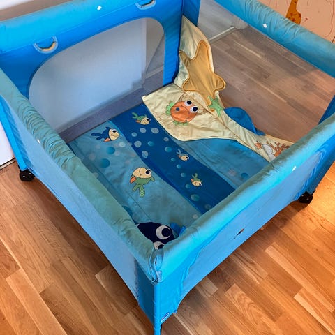 Fin och smidig resesäng med madrass och transport/förvaringsväskor. Kan även användas som lekhage (mestadels det vi använt den till 😅)