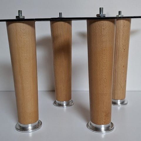 Vita 4 stycken 10 cm höga möbelben (plus 2 cm skruv) i trä, diameter 6 cm.