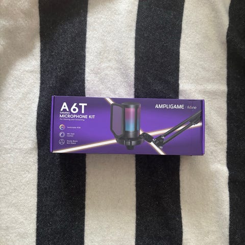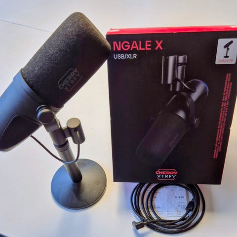 Sitter monterad på en mickarm men medföljer även orginal bordsstativ.