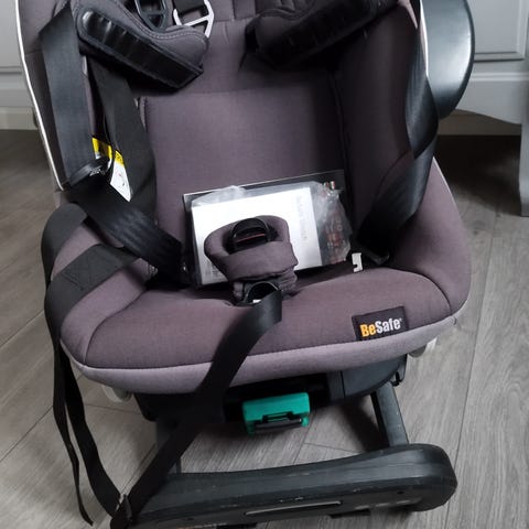 BeSafe Stretch Bilbarnstol i mörkgrå färg och ventilerande meshtyg. Tillverkningsår 2022 och använd sedan hösten 2022.