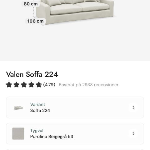 Nypris 24900:- Vårt pris 14000:- eller högsta bud. https://sweef.se/p/soffor/valen?srsltid=AfmBOoquzUiDSS1VwFrhY0qdtOy6Smz51msfDV2-J6-nXTUSp83S6OBc&v=VAL-35&frame=SOL-17&extras=RI-SI