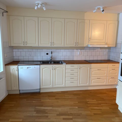 Kök- ikea, fronter beiga, bänkskiva i laminat, från 2005.