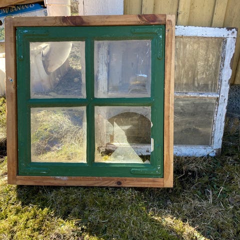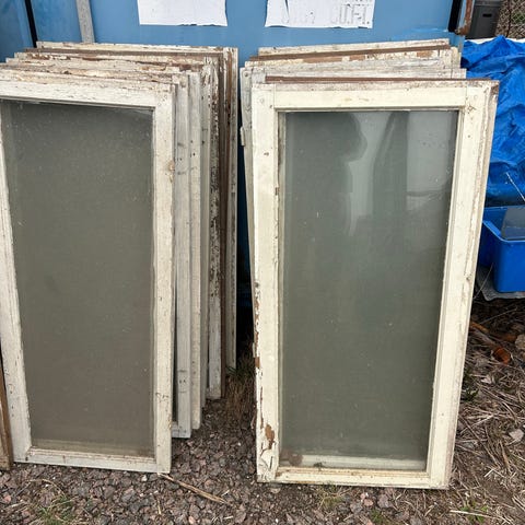 Det lilla utan innerfönster följer med i köpet. 65x100 cm med karm. Ett extra till finns. Tror två rutor var trasiga.