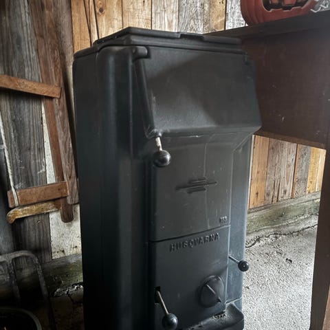 Husqvarna Modell 727 vedspis i gjutjärn med tre kokplattor. Aldrig använd av oss men sannolikt fullt funktionell.