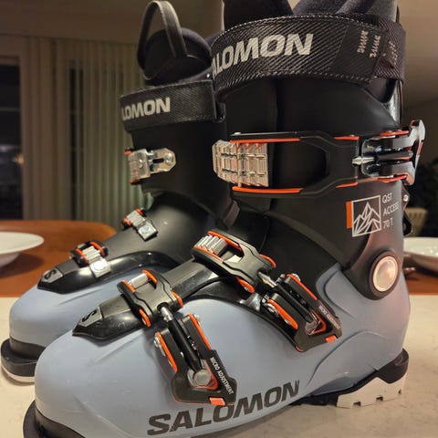 Salomon Access X70 W skidpjäxor för dam. Skidpjäxorna är designade för att ge stöd och komfort vid skidåkning. De har justerbara spännen och en kombination av svart, vitt och blå färg. Passar för dam och erbjuder en bra passform för skidåkning.