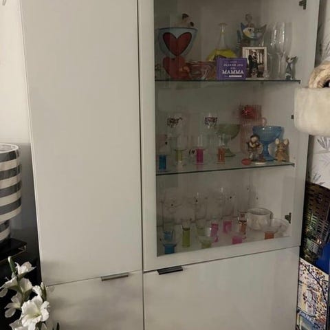 Vitrinskåp från Mio. Jag har monterat speglar inuti för en mer öppen och lyxig känsla. Går att ta bort om så skulle önskas. Mycket sparsamt använd.