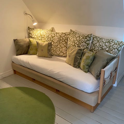 Soffa bäddsoffa i röd färg med bladmönster. Möblerad med två kuddar i samma tyg. Soffan kan fällas ut till en säng med en madrass i vitt tyg med mönster.