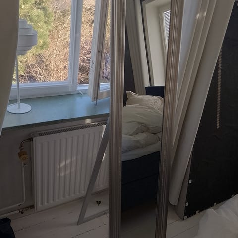 Stor spegel att hänga på väggen. Vit, lite borstad, fina dekorativa detaljer. Skick som ny.