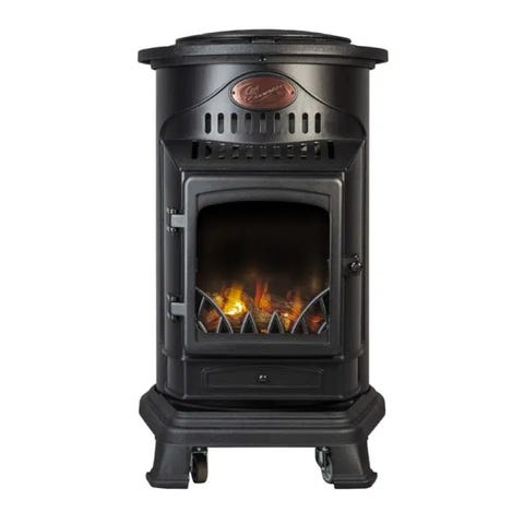 Gasolkamin med tillhörande två gasolflaskor. Kaminen är svart och av standardstorlek för vedeldning. Gasolflaskorna är av metall och avsedda för anslutning till kaminen för uppvärmning.