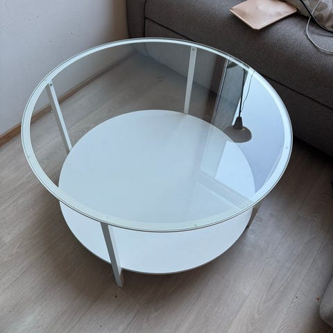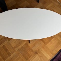 IKEA bord med ovalt bordsskiva i vitt. Bordet har en nedre hylla för förvaring och är designat av Alberto Meda.