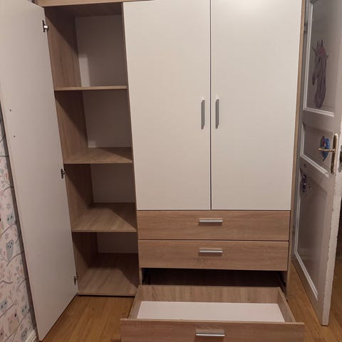 Varje garderob har två lådor längst ner samt klädhängare och flyttbart hyllplan i skåpet. Stabila och fullt funktionella !