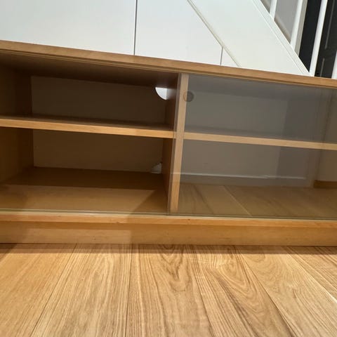Fin och praktisk TV och mediabänk i ekfinish, varsamt använd. Den nedersta hyllan är 42 cm djup. Finns i Täby.