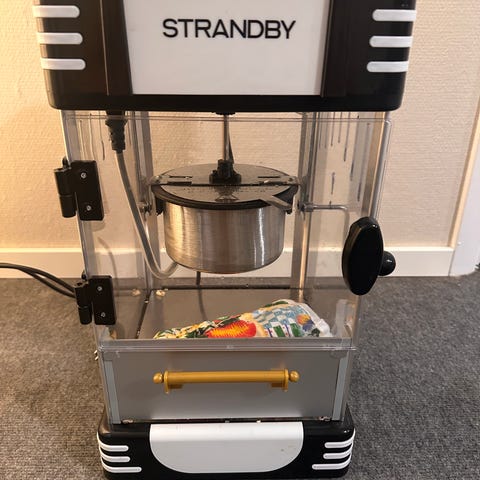 Popcornmaskin i svart färg. Maskinen är utformad för att snabbt och enkelt poppa popcorn direkt i skålen. Den är kompakt och passar för hemmabruk.