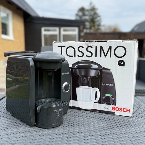Bosch Tassimo kaffemaskin i svart färg. Maskinen är designad för att brygga kaffe med Tassimo kapslar. Den har en kompakt storlek och är enkel att använda för snabb kaffebryggning.