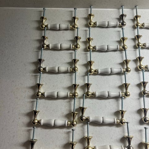 Parti blandade beslag/handtag i trä och metall.