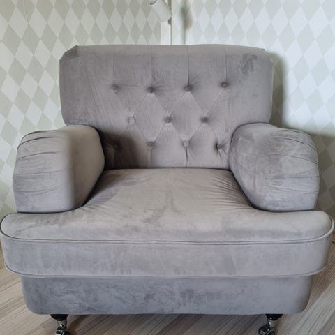 Säljer en stilren och bekväm fåtölj i mjuk grå sammet. Fåtöljen har ett klassiskt, tidlöst utseende med dekorativa knappar i ryggstödet och nitar framtill som ger en exklusiv känsla. Stadiga ben i krom/metall ger både stabilitet och modern design.