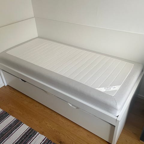 IKEA säng ”Släkt” + resåmadrass ”Hafslo” med förvaring, vit