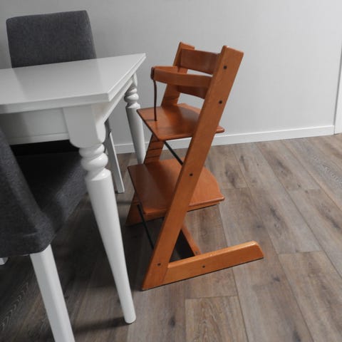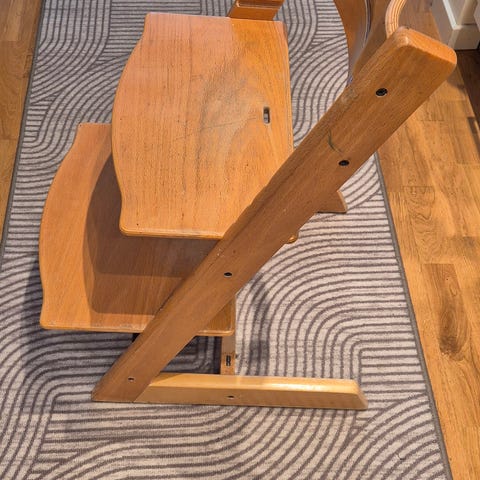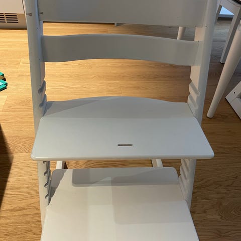 Stokke Barnstol Tripp trapp tillverkad i ek. Vitpegmenterad. Passar som barnmöbel med justerbar sitt- och fotstöd för ergonomisk sittposition. Följer med bygel i beige.