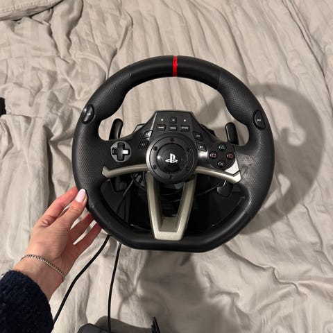 Thrustmaster T300 RS ratt och pedalset för racingspel. Utrustad med en ratt med flera knappar och justerbara pedaler för gas, broms och koppling. Ansluts via kabel och är kompatibel med olika racingspel och simulatorer. Funkar på PC och Xbox