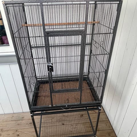 Fågelbur i svart metall med måtten 151,5 x 90,5 x 72 cm