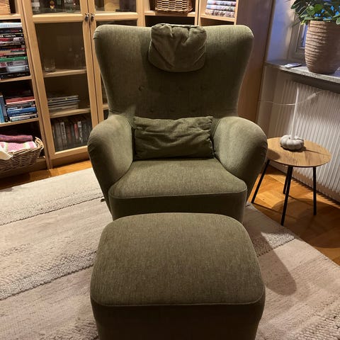 Helt ny, bilderna i annonsen är lånade men bilder på den faktiska fåtöljen kan så klart ordnas vid intresse.