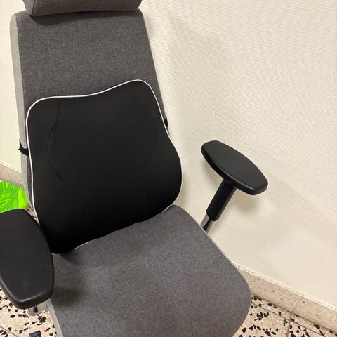 IKEA kontorsstol med rosa tygklädsel. Stolen har hjul och är anpassad för kontorsbruk.