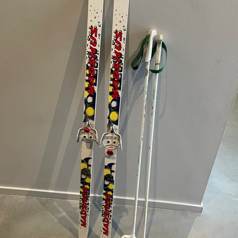 Madshus L 155 skidor med bindningar, kompletterade med ett par skidstavar och ett par skidpjäxor. Skidorna är röda och har en längd på 155 cm. Stavar och pjäxor medföljer som tillbehör. Strl 37 på pjäxorna.
