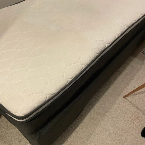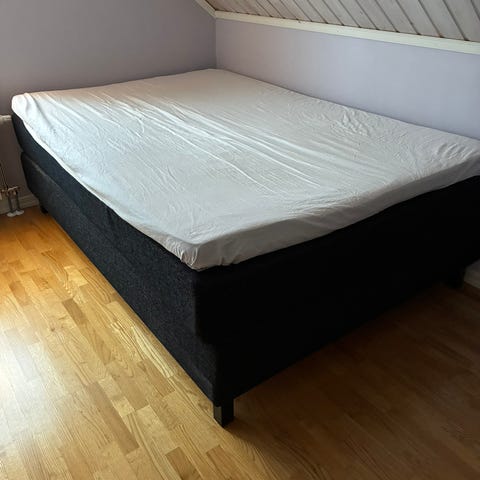 Vi ska göra om sovrummet och därför säljer vi en vanlig kontinentalsäng 120x200 med svart klädsel och svarta ben från Jysk. En bekväm säng med bra komfort. Praktisk med plats av 3-4 förvaringslådor under.