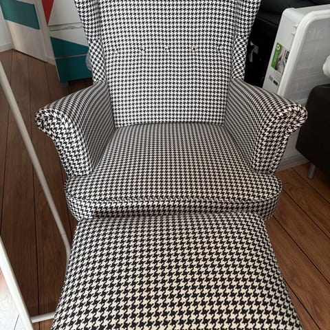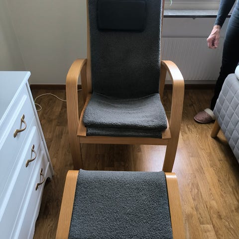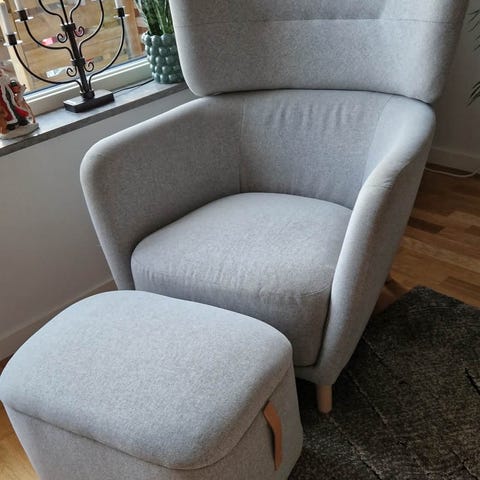 Strandmon fåtölj med fotpall i bra skick. Oftast använd med skyddande nackkudde. Hämtas Segepark Malmö.