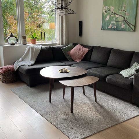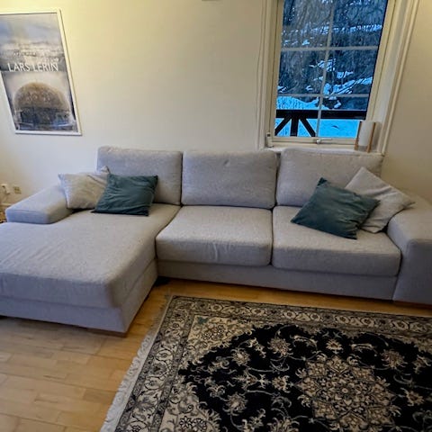 Paketpris på soffa med två divaner, matta 2x3m, runt bord 80cm samt taklampa