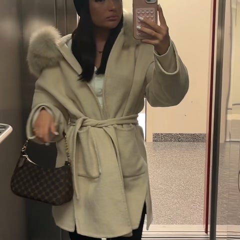 Gråmelerad jacka i pälsimitation med hög krage och knäppning framtill. Två sidfickor samt en innerficka. Jackan har en vackert mönstrad insida. Dyr i inköp. Sparsamt använd