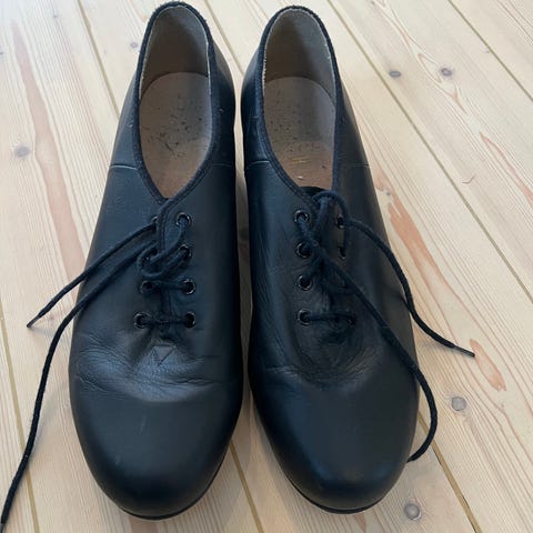Bloch stepp damskor i svart läder, storlek 35. Skorna har snörning och en låg klack med steppjärn fram och på klack. Passar för dans och stepp. Välkommen