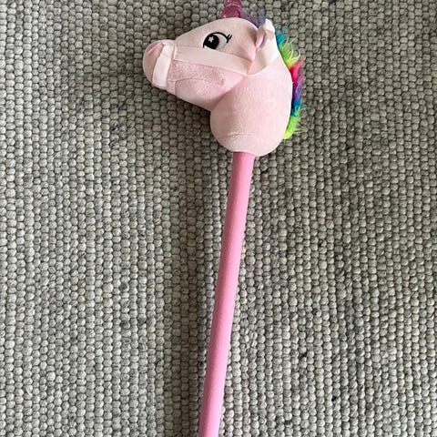 Hej säljer det som syns på bilden : 3 st käpp hästar, kanin matta , sänghimmel .