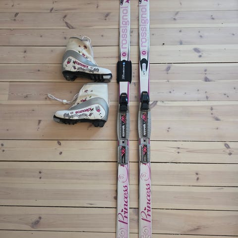 Mycket fint skidpaket för barn bestående av längdskidor (137 cm) med bindningar (SNS profil) pjäxor i storlek 36 2/3 och stavar (105cm). Pjäxorna har skönt fleecefoder för värme. Skidorna är räfflade och därmed vallningsfria vilket fungerar mycket bra.