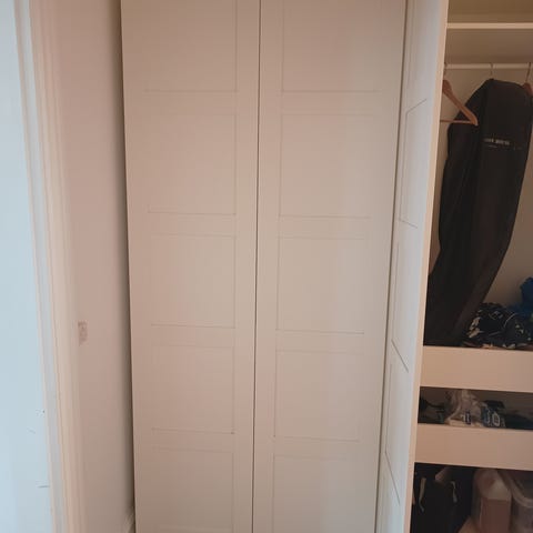 IKEA PAX garderob med spegeldörrar i vitt utförande. Garderoben har plats för upphängning och förvaring med hyllor. Passar för förvaring av kläder och andra personliga tillhörigheter.