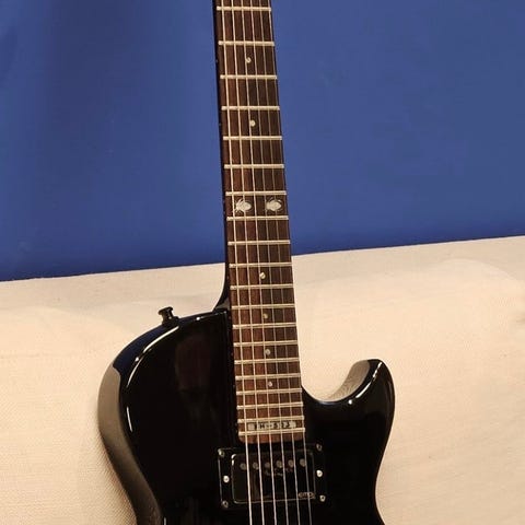 Gitarren har en solid kropp och hals i mahogny med en mörkbrun finish. EMG aktiva humbucker-pickuper. Mycket fint skick!