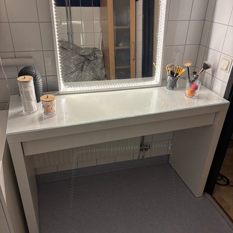 Sminkbord i ekfaner med förvaring. Finns också en spegel som kan ingå. Hämtas på plats.