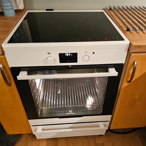 Electrolux induktionsspis med ugn och induktionshäll. Vit färg och modern design. Passar för matlagning med induktionskärl och har ugn med flera funktioner för bakning och stekning.