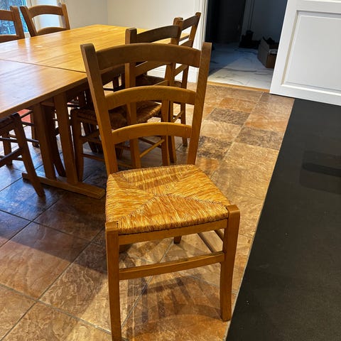 En av stolarna har en liten skada på fotstödet, går enkelt att laga för den händige.