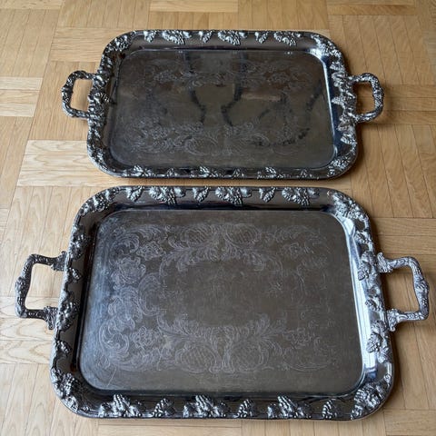 Det med antikt utseende är silverpläterat enligt etiketten. De andra två är jag osäker på. Det runda har några fläckar som jag gissar går att polera bort. Precis för alla tre.