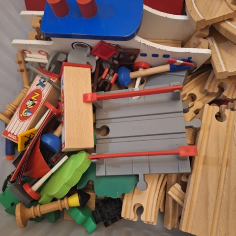 BRIO Tågbana och byggklossar barnleksaker består av svarta tågbansspår och färgglada byggklossar i olika former och storlekar. Produkten är avsedd för barn och kan användas för att bygga tågbana och skapa olika konstruktioner med klossarna.