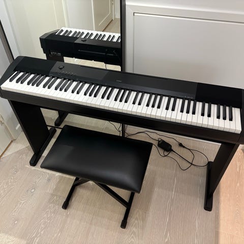 Pianot har ett komplett tangentbord med 88 tangenter, svart färg.